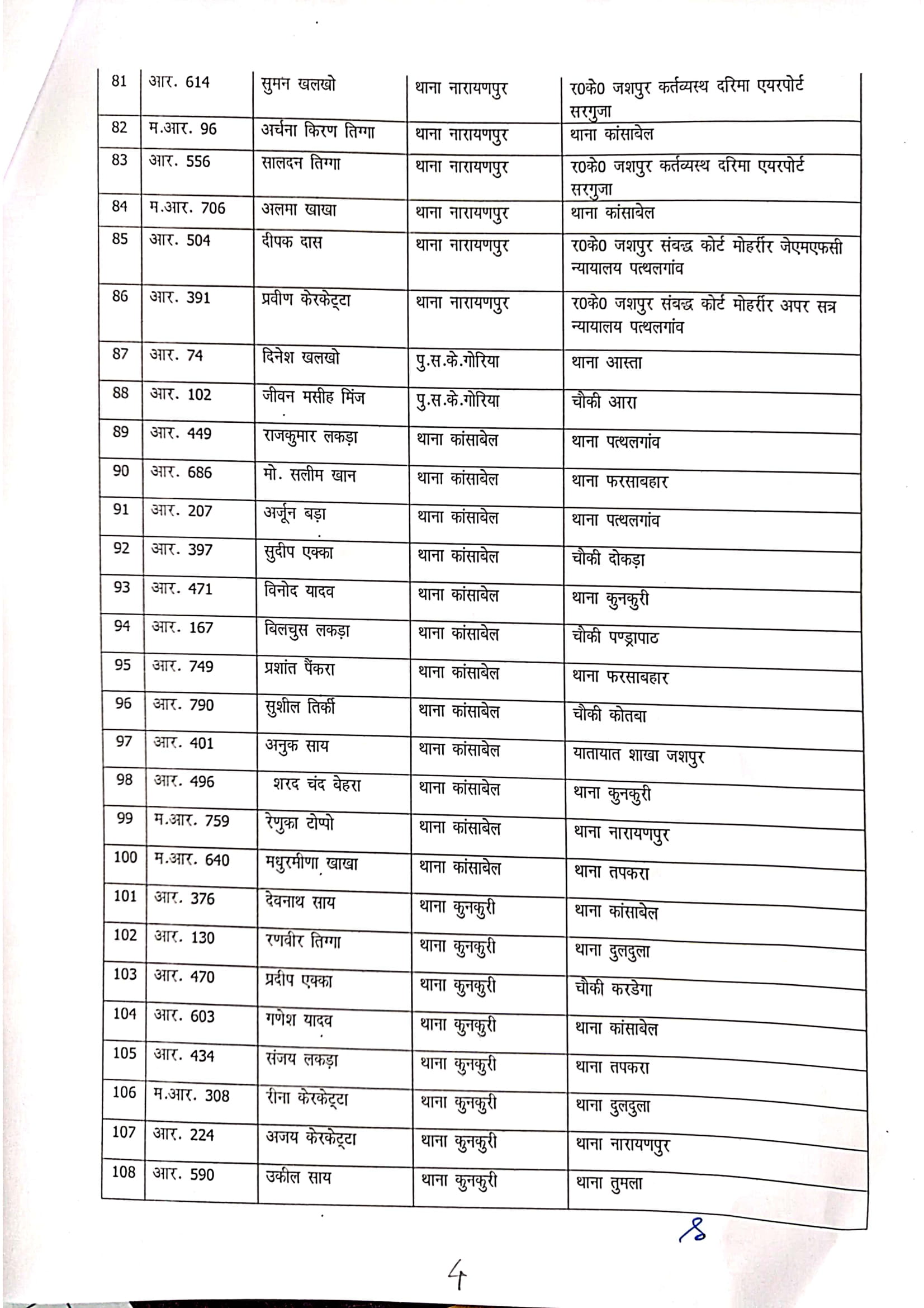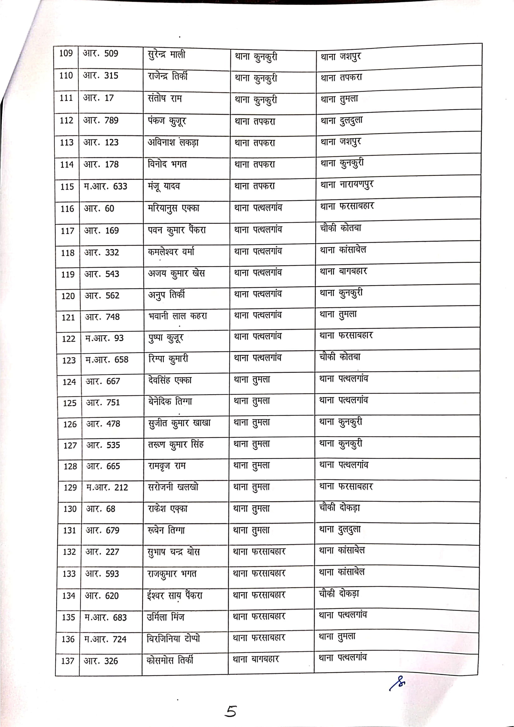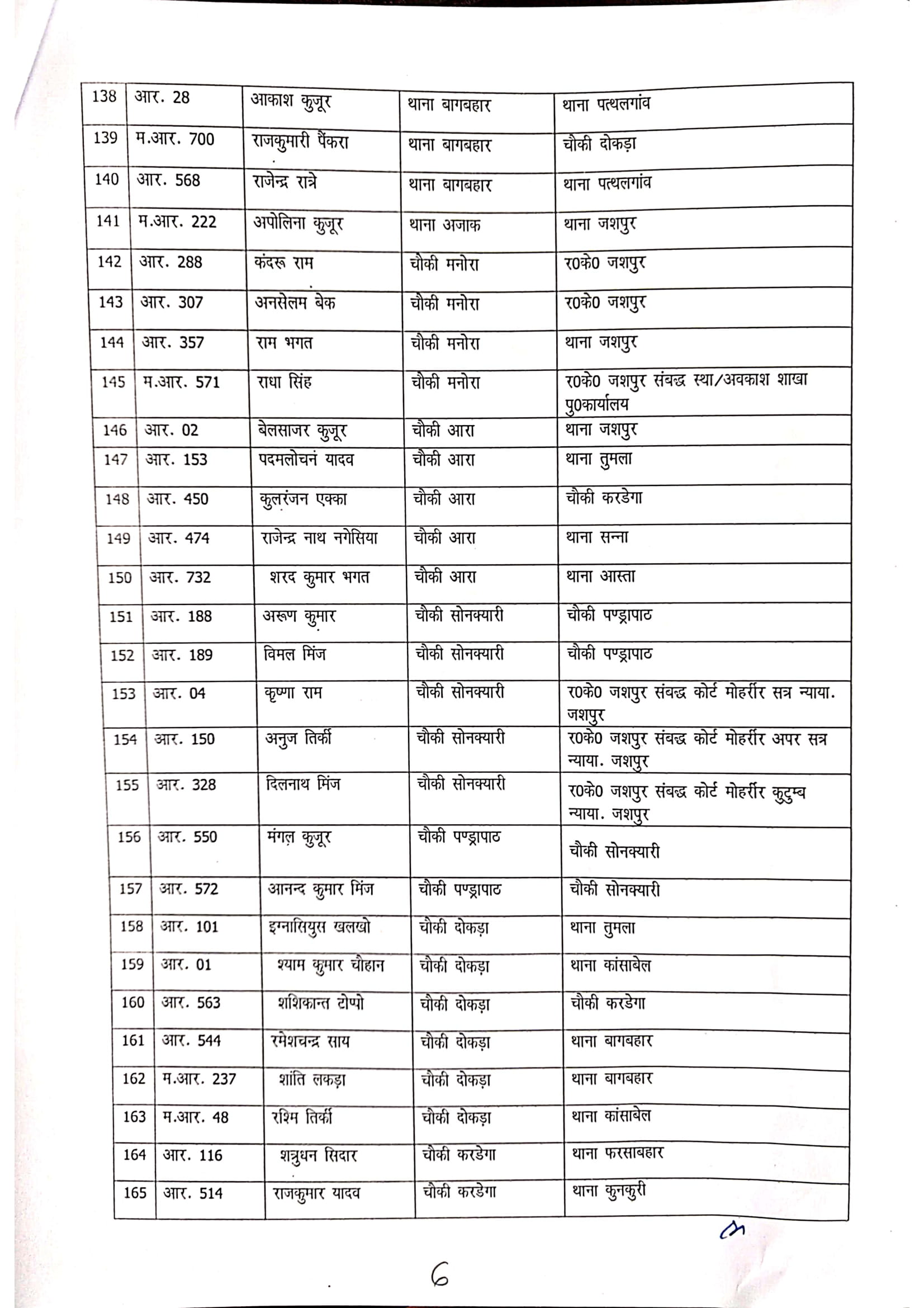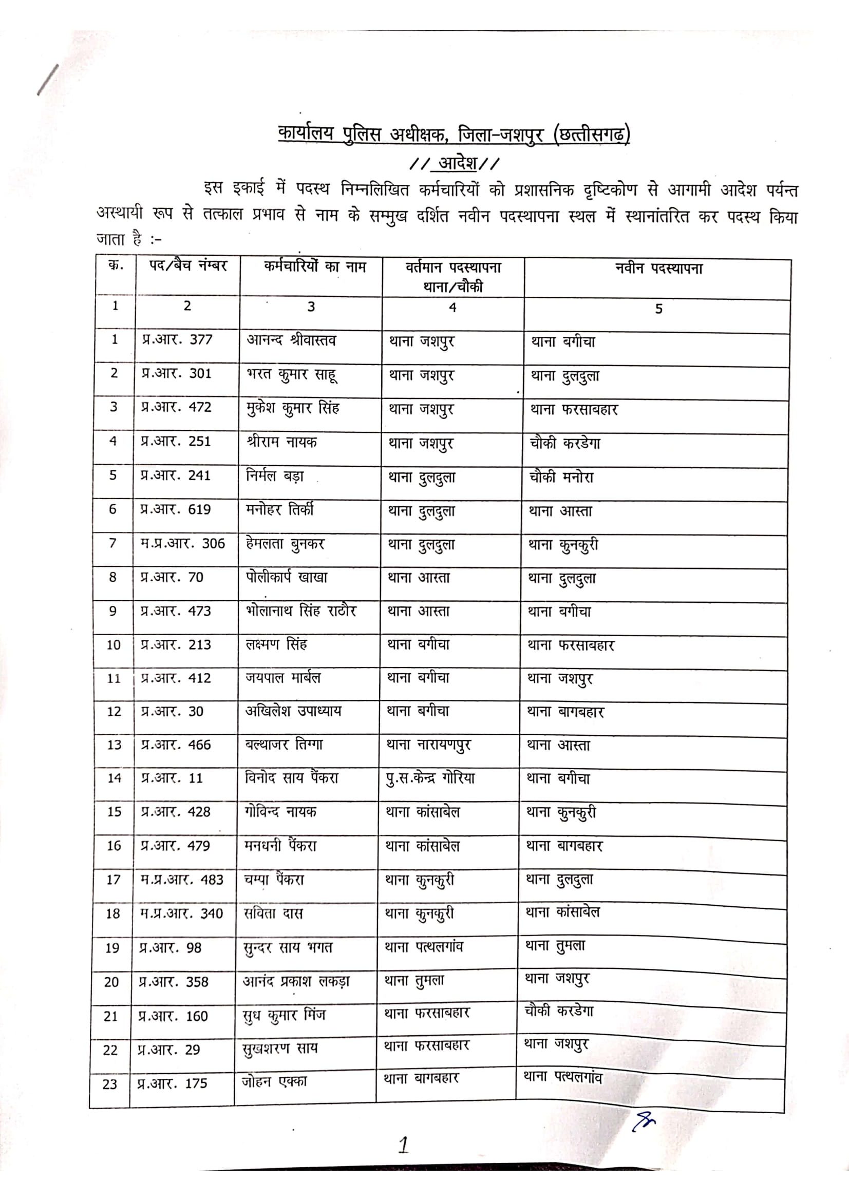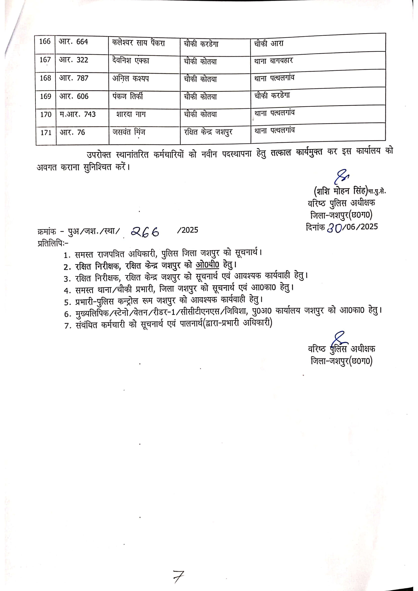 जशपुर : छत्तीसगढ़ के जशपुर जिले के पुलिस विभाग में बड़ा फेरबदल हुआ है. आरक्षक, प्रधान आरक्षक सहित 171 कर्मचारियों का ट्रांसफर हुआ है. एसएसपी शशि मोहन सिंह ने इसके आदेश भी जारी कर दिए हैं. इन्हें जल्द से जल्द नई पदस्थापना जगह में पदभार लेने के भी आदेश जारी कर दिए गए हैं.