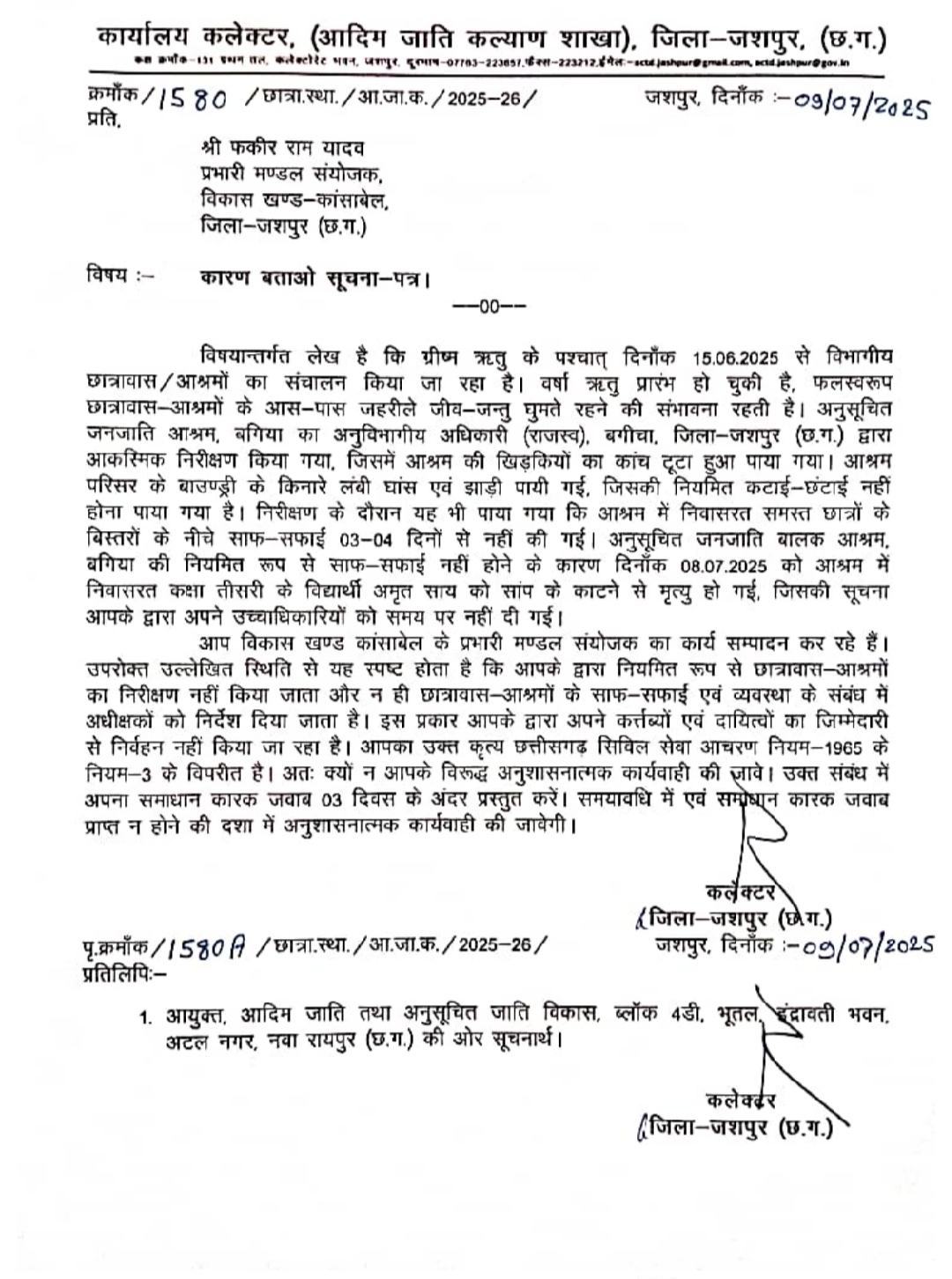 आप विकास खण्ड कांसाबेल के प्रभारी मण्डल संयोजक का कार्य सम्पादन कर रहे हैं। उपरोक्त उल्लेखित स्थिति से यह स्पष्ट होता है कि आपके द्वारा नियमित रूप से छात्रावास-आश्रमों का निरीक्षण नहीं किया जाता और न ही छात्रावास आश्रमों के साफ-सफाई एवं व्यवस्था के संबंध में अधीक्षकों को निर्देश दिया जाता है। इस प्रकार आपके द्वारा अपने कर्त्तव्यों एवं दायित्वों का जिम्मेदारी से निर्वहन नहीं किया जा रहा है। आपका उक्त कृत्य छत्तीसगढ़ सिविल सेवा आचरण नियम-1965 के नियम-3 के विपरीत है। अतः क्यों न आपके विरूद्ध अनुशासनात्मक कार्यवाही की जावे। उक्त संबंध में अपना समाधान कारक जवाब 03 दिवस के अंदर प्रस्तुत करें। समयावधि में एवं सम्प्रेष्यन कारक जवाब प्राप्त न होने की दशा में अनुशासनात्मक कार्यवाही की जावेगी।