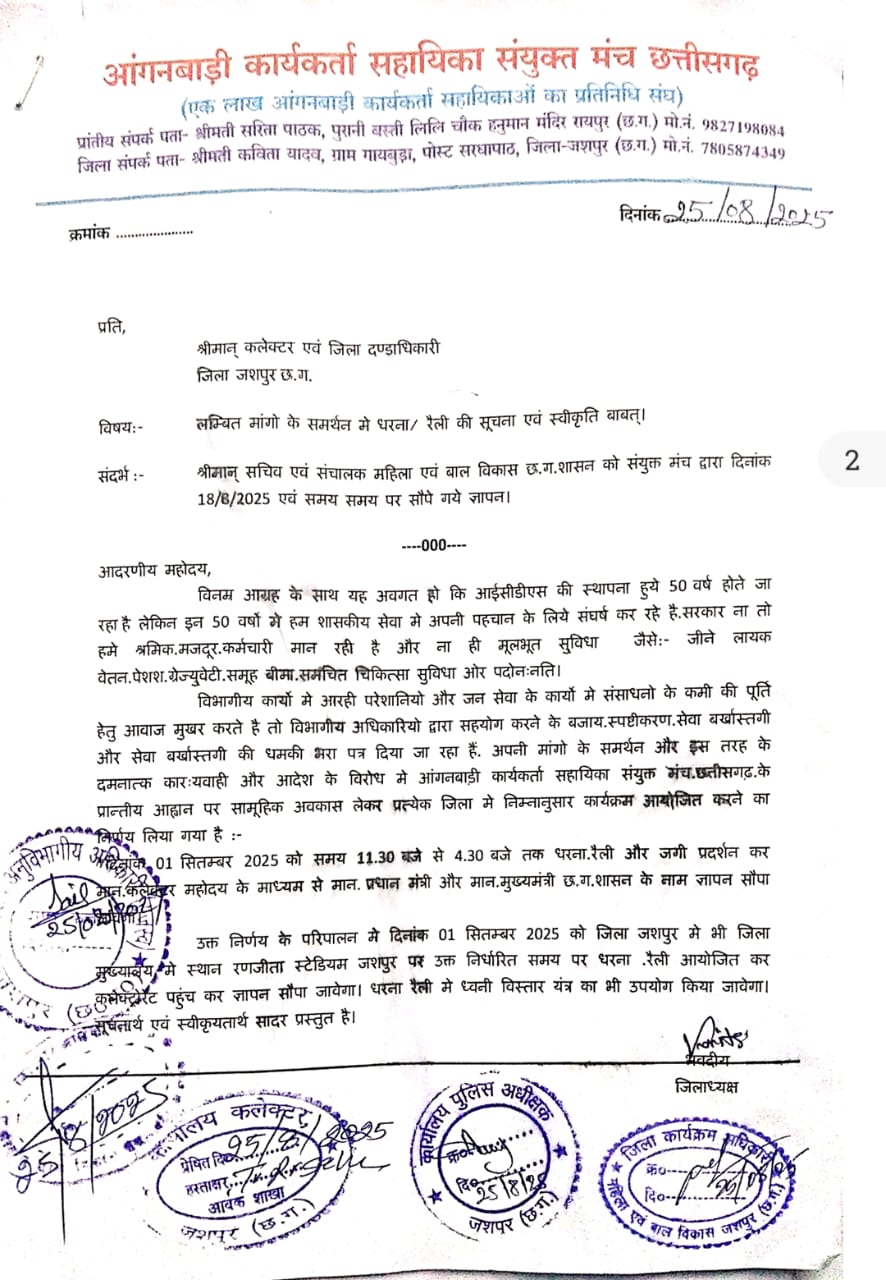 जशपुर 30 अगस्त 2025 : आगामी एक सितंबर को सामूहिक अवकाश ले एक दिवसीय हड़ताल करने की सूचना दिए जाने के साथ ही आंगनबाड़ी कार्यकर्ताओं और सहायिकाओं को शासन के निर्देश पर विभाग प्रमुखों के द्वारा हड़ताल में शामिल होने पर मानदेय में कटौती और बार- बार हड़ताल किए जाने पर बर्खास्त किए जाने की चेतावनी दी गई है।