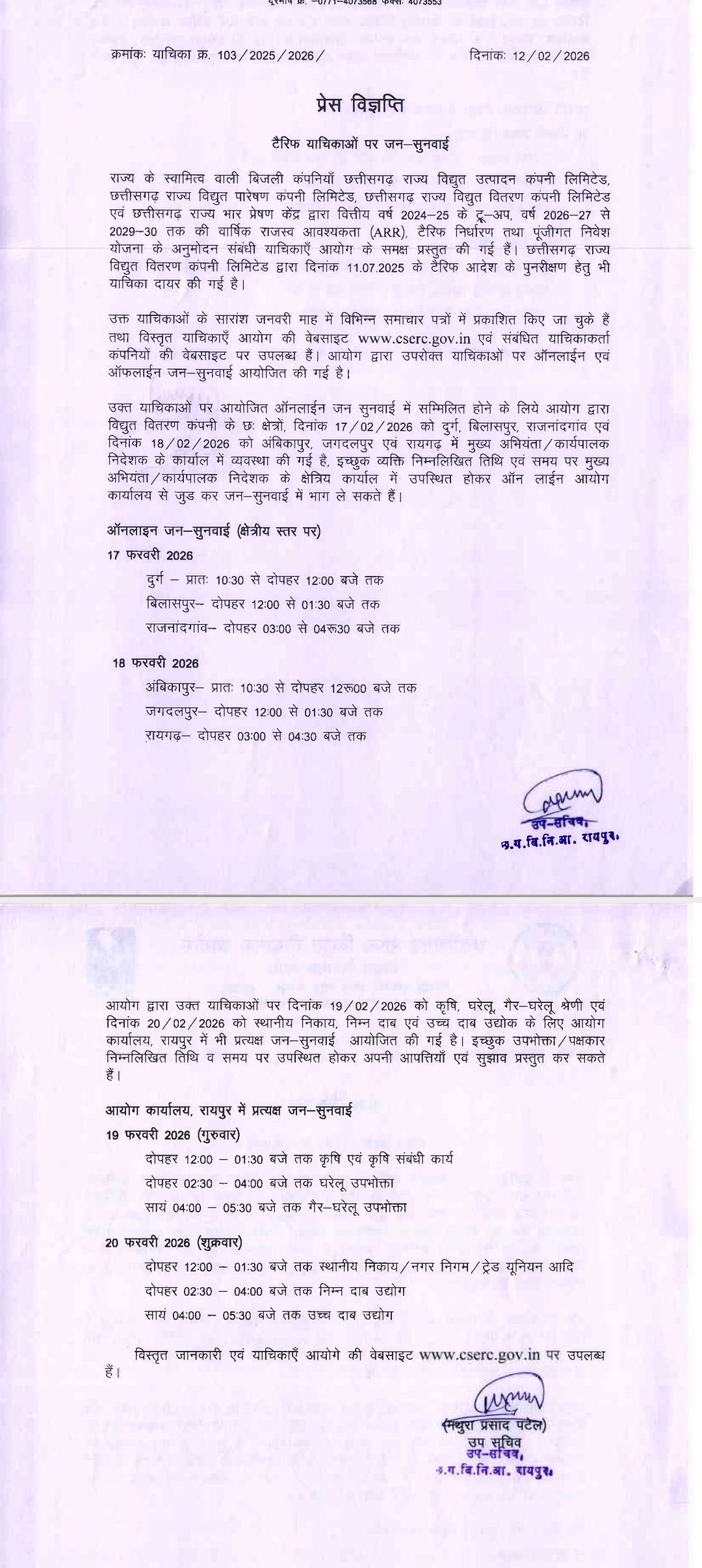इसके अलावा आयोग द्वारा रायपुर स्थित कार्यालय में 19 और 20 फरवरी 2026 को प्रत्यक्ष जन-सुनवाई भी आयोजित की जाएगी, जिसमें विभिन्न श्रेणियों के उपभोक्ताओं को अलग-अलग समय पर अपनी बात रखने का अवसर दिया जाएगा।